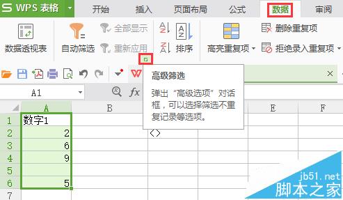 2、选择筛选区域。点击“数据”->“高级筛选”,如下图