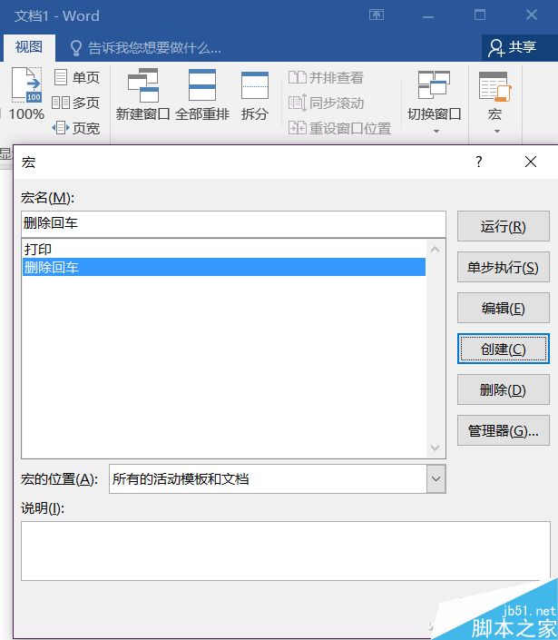 在Word文档中,切换到视图页面,点击最左侧的“宏”,在弹出窗口内,输入一个名字,比如删除回车之类的,然后点击“创建”。