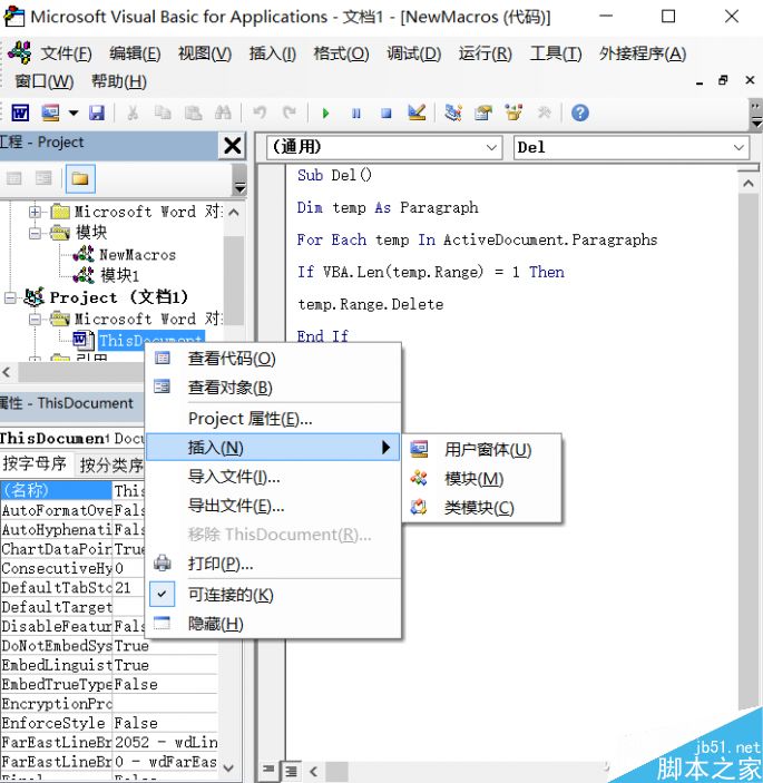 在弹出的Visual Basic for Applications界面中,右键单击左侧栏“Project(文档1)—Microsoft Word对象”,选择“插入”中的“模块”。