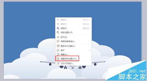 2、在要复制背景的幻灯片上点击鼠标右键弹出下来菜单,在下拉菜单里找到【背景另存为图片】选项,如下图所示。