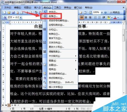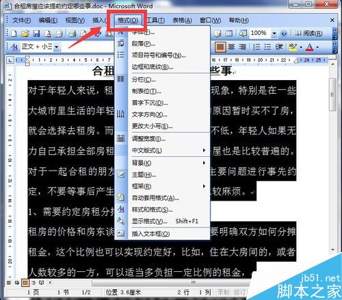3、选中文字以后,点击word文档上方的菜单项中的“格式”,会弹出一个下拉菜单,如图所示。