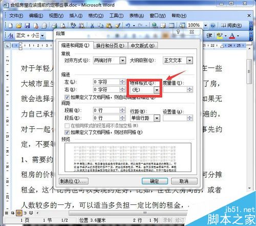 5、点击段落以后,弹出了一个对话框,我们找到其中的“特殊格式”,点击他右面的倒三角,如图所示。