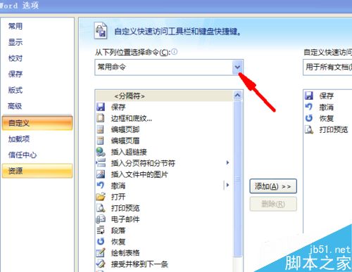 4、选择自定义按钮之后会进入到自定义控制面板,我们单击“从下列位置选择命令”下方的小倒三角形。