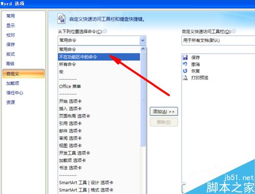 5、选择小倒三角形之后会有一个选项,那就是“不在功能区中的命令”,我们单击该选项。