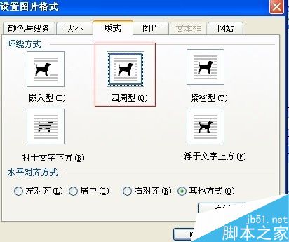 7、在弹出的选框中,我们选择版式,会看到有几种环绕的方式,我们点击四周型