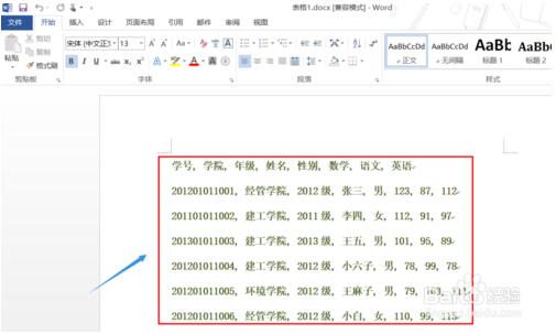 3.这个时候刚才的一大段文字就全部装进了系统默认的表格里,见下图;不过表格的文字匹配不是太好,接着点击"布局"-"自动调整"-"根据内容自动调整表格"