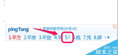 我们直接用搜狗输入法直接输入:我们拼写“平方(pingfang)”,如图,选择数字符号的平方。