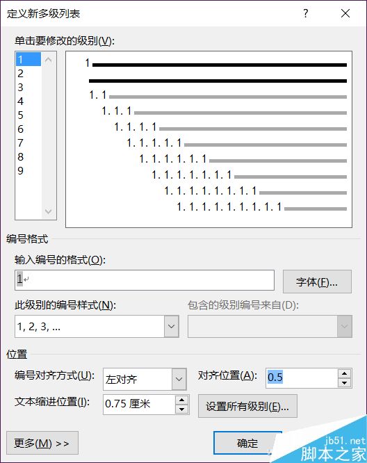 比如我们选择了数字编号,但是编号段落的文本之间的间距并不是想要的,这个时候还可以进一步在多级列表中进行调节。首先按住Ctrl键不松手,然后点选要调整间距的段落,单击“多级列表”下拉菜单(小三角),选择“定义新的多级列表”进行调整,在弹出菜单的下半部分“位置”中,对“对齐位置”、“文本缩进位置”进行相应的修改,具体数值要根据文档使用需求来定。