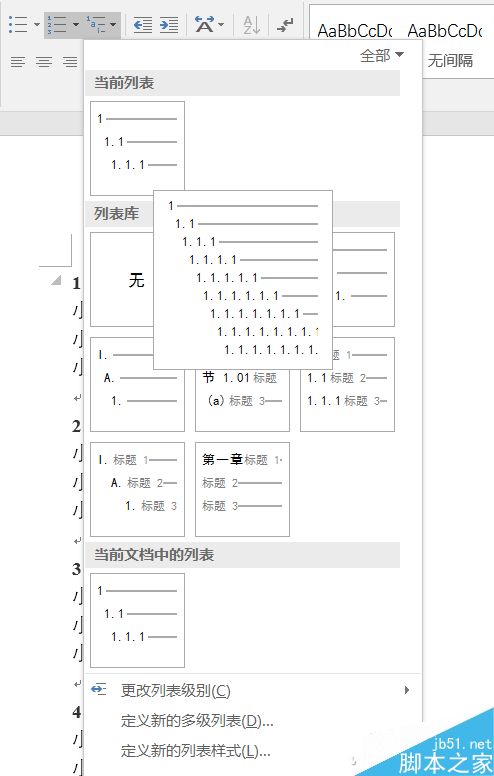 回到主编辑界面,还是找到“多级列表”,选择你需要的格式,例如我们图中所示的方案。当设置好第一级标题后,重复动作将光标分别放置在要设置的层级标题上,二级标题就在“段落”中设置“2级”,以此类推。最后用这一步的操作设置,子标题就会按照要求自动设置好了。