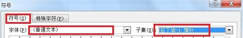 在打开的“符号”对话框中单击“符号”标签,在“字体”中选择“(普通文本)”,并在“子集”中选择“拉丁语-1 增补”。
