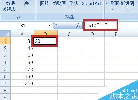 现在吧光标移动到“B1”单元格,输入“=A1&"°"”并回车。