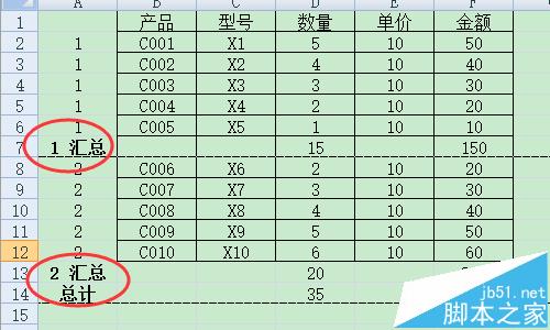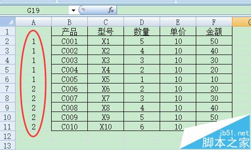 2、使用A列作为辅助列,我们分开汇总1到5产品和6到10产品。在A列输入数据如图。