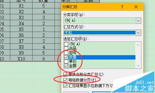 4、分类汇总窗口中,分类字段我们选择列A,汇总方式:求和,汇总项选择数量和金额,并勾选每组数据分页。