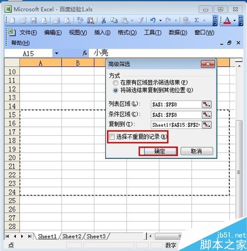 8、打钩“选择不重复的记录” 然后点击“确定” 如图