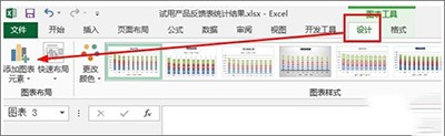 4、双击条形图可以打开【设计】标签,找到【添加图表元素】