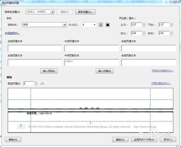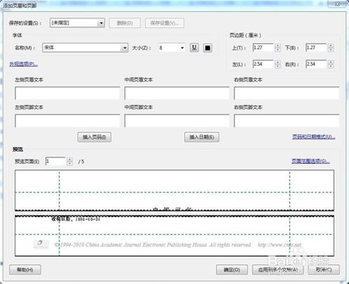 3、点击“页眉和页脚”旁边的黑色三角符号,下拉菜单里有添加页眉和页脚,点击弹出如下对话框。可以对页眉页脚的格式进行设置,页码也属于页眉页脚的一部分。中部的六个方框用于填入你需要的内容,可以根据你的需要将鼠标定位在其中一个方框内,然后点击插入页码。则可以在下方的预览框中看到效果。