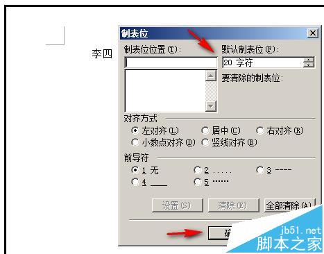 6、说到这个“制表位”,小编在这里顺便说下“制作位"的其中一个功能。比如,在文档上输入“李四”;现在想把“四”字移到第20字符的位置;那么,操作如下;把光标定位在“四”的前面;