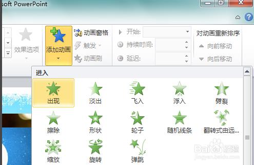 4、常用的动画有进入动画和退出动画,我们先设置进入动画,选择想要的进入效果即可