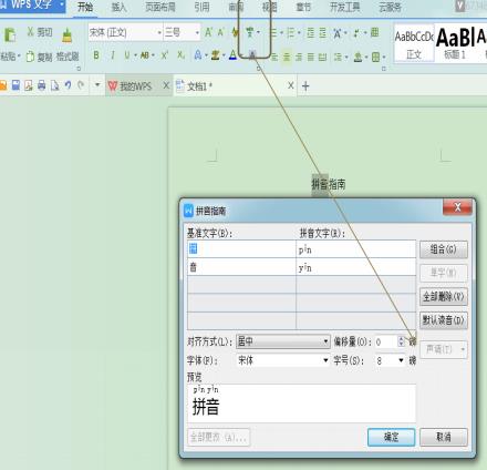 3、拼音指南:我们在阅读时会碰上一些不认识的字,这时需要借助拼音,如果去搜索很麻烦,直接点”文“字会出现一个对话框中的拼音指南,在插入拼音前要先选中需要标注拼音的字。如果要删除再点击对话框选择”全部删除“就可以。