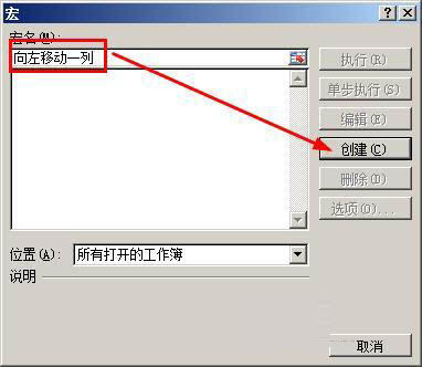 2、打开了宏对话框,我们填写宏名为【向左移动一列】,然后点击【创建】按钮。