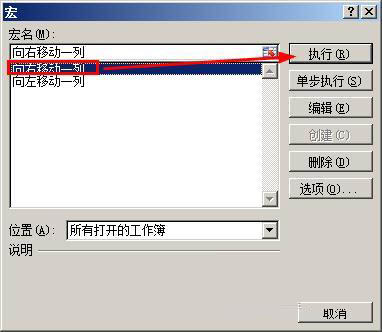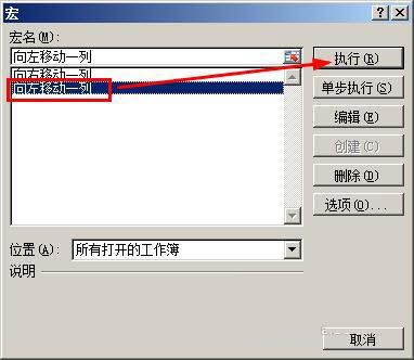 10、点击【向左移动一列】,选中这个宏,然后点击【执行】。