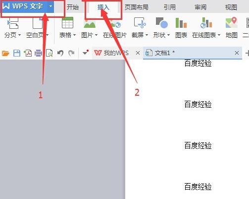 3、在新建立的wps文档中输入我们的文件内容,待文件内容完成后,我们就开始设置页码。此时在“wps文字”的右边可以找到“插入”这个选项。然后点击“插入”,找到页面顶部右边的“页码”选项,如下图所示