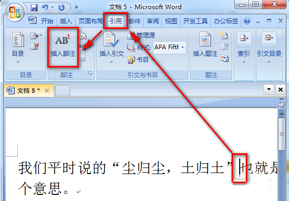 2、将光标放在要插入的文本后面,选择【引用】-【插入脚注】。