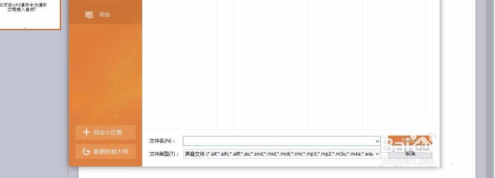 4、点击插入音频,如图所示,选择事先准备好的音频文件,然后点击打开,