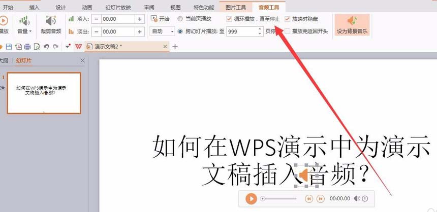5、选择好音频文件后,返回到演示文稿窗口,如图所示,音频文件已经添加成功了,在音频工具处,可以对插入音频的音量、开始方式以及是否循环的那个进行设置。
