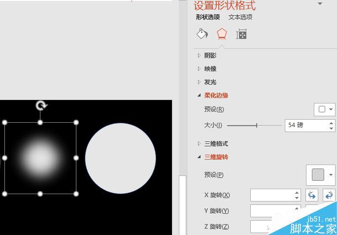 再绘制一个白色的圆,选中后在右侧设置窗格中切换到“效果”项中(点击正五边形图标),点击展开“柔化边缘”,拖动“大小”滑钮,将其边缘虚化。