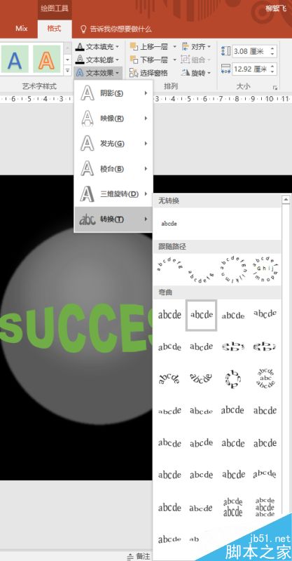 现在看起来,文字是平的,没有立体感。我们需要将这条文字变成中间大两边窄的效果,它才会与球体吻合到一起。选中文字后,切换到“绘图工具-格式”,点击“文本效果→转换”,在弹出菜单中,选中中间大两边窄的艺术字效果。