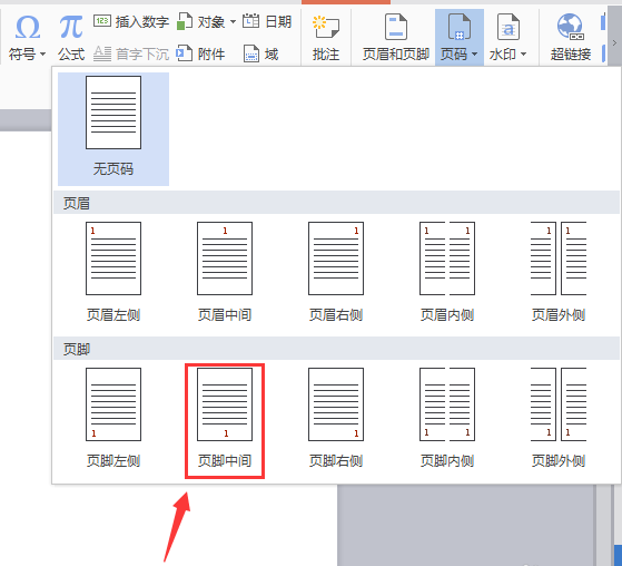5、点击页码选项,在其子级菜单里找到页脚中间选项,如图所示:
