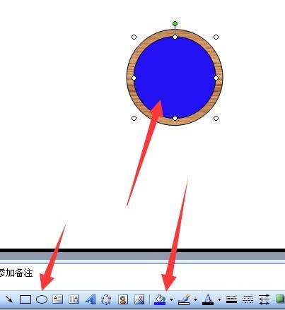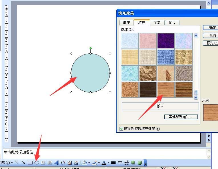 1、先按住shift键,绘制出一个正圆,再设置正圆的填充效果为栎木纹理,如图。