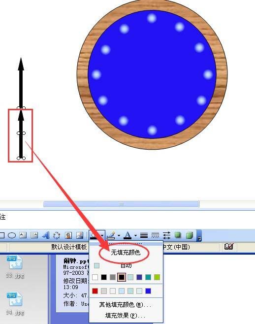 4、在自选图形里找到箭头,画出一个黑色箭头做为秒针,把它复制多一个接在第一个的下方,再把下方的设置成无颜色,如图