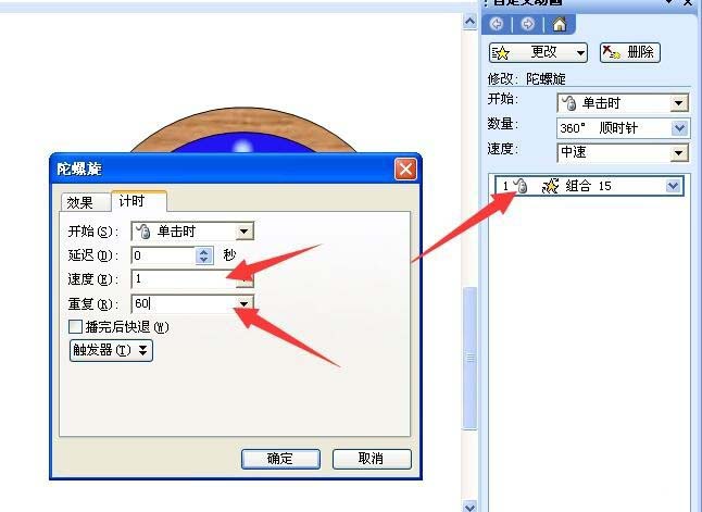 6、选择添加效果——强调——陀螺旋,双击右侧出现的动作“组合”,设置速度为1秒,重复60次,如图。