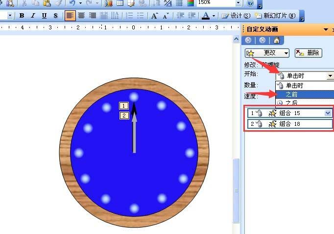 8、把两个动作选中,设置开始的单击时为之前,OK,一个秒针分针的闹钟就作好了。播放下试试看吧。