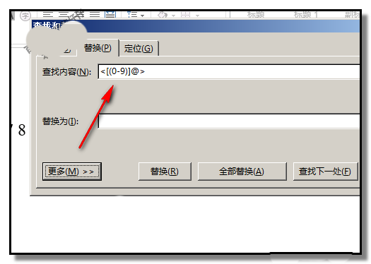 3、在操作框的“查找内容”这里,输入代码:<[(0-9)]@>