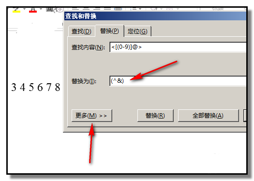 4、在“替换为”这里输入代码:(^&),再点下“更多”按钮