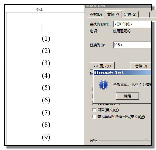 6、再点击“全部替换”,关闭操作框;可以看到文档中的数字已全部一个不漏的加上了括号。