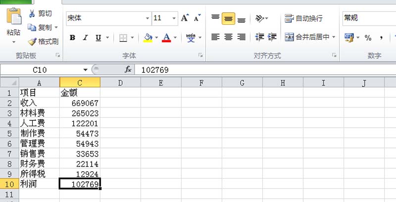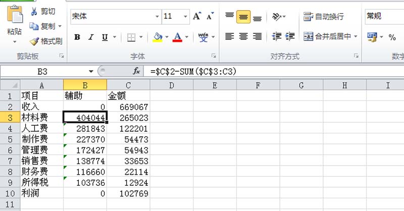 2、选择b列右键单击从下拉菜单中选择插入一列,设置标题为“辅助”,在单元格b2中输入公式=$C$2-SUM($C$3:C3),然后填充。