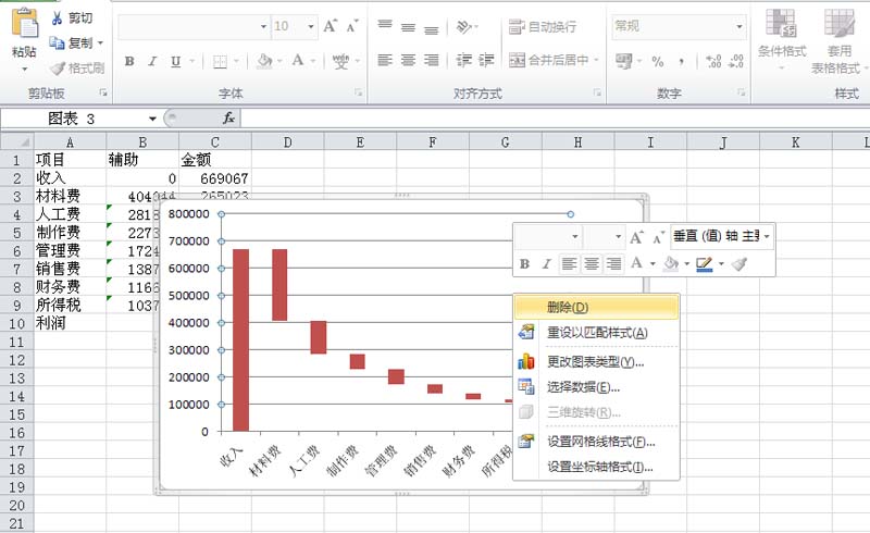 5、点击网格线选中,右键单击从下拉菜单中选择删除命令,将图表中的网格线删除。