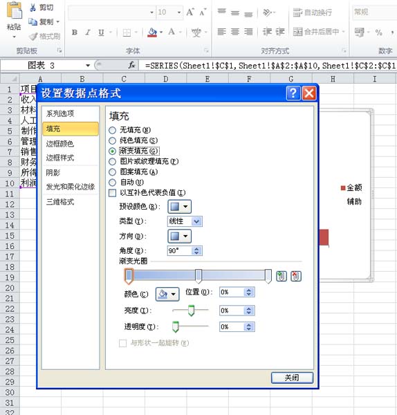 7、选择第一个柱形,右键单击从下拉菜单中选择设置数据点格式选项,在弹出的对话框中设置渐变填充,点击关闭按钮。