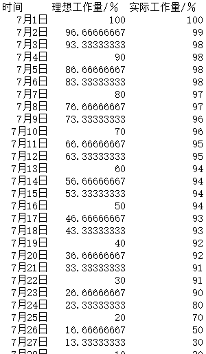 1、首先,我们需要有一个数据库,记录任务量随时间变化的剩余值,用于作为EXCEl作图时的数据点。此外,我还增加了一列理想的、直线下降的燃尽图的任务剩余量,作为对比。数据手动输入、由其他处复制粘贴、公式计算均可。