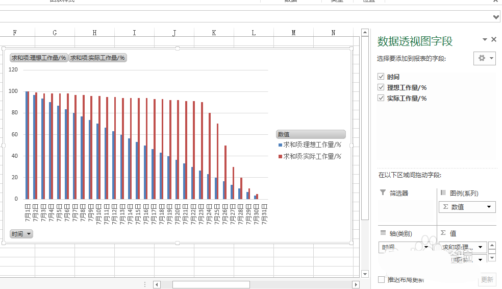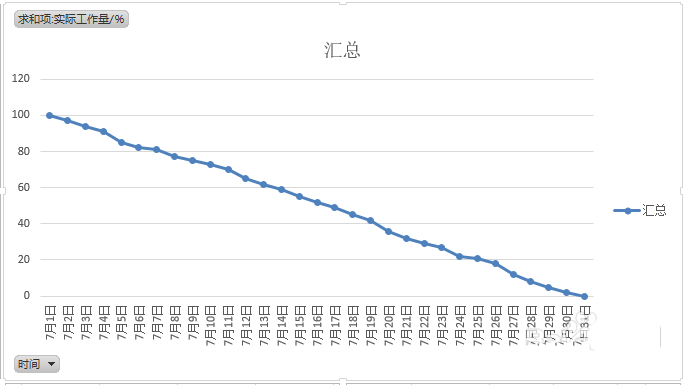 4、本例中,燃尽图的横坐标为时间,我们鼠标左键按住数据透视图字段列表中的时间,将其拖进下方的 轴(类别) 方框里。将理想时间、实际时间拖进 值 方框里,EXCEL通过分析,自动画出我们想要的燃尽图。