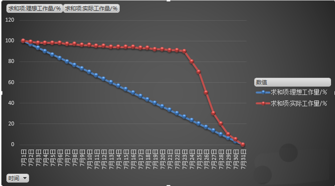 燃尽图是使用时间为横坐标,任务量为纵坐标的图,通过分析燃尽图的走向、趋势,分析工作的效率、认真程度等。