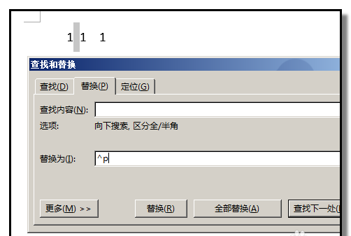 7、按下:全部替换,弹出系统提示,提示替换了8处,关闭对话框。看到文档中的本来4行3列的数据变成了一行了。