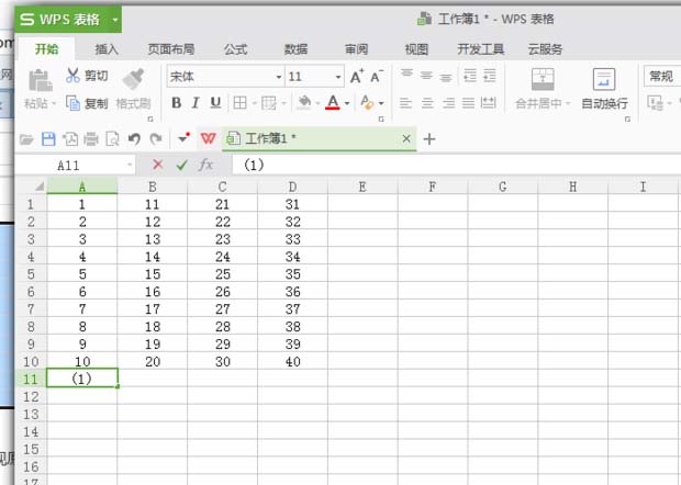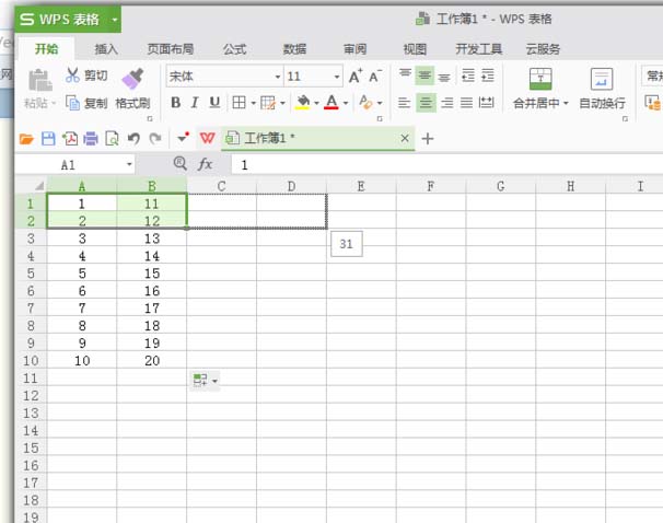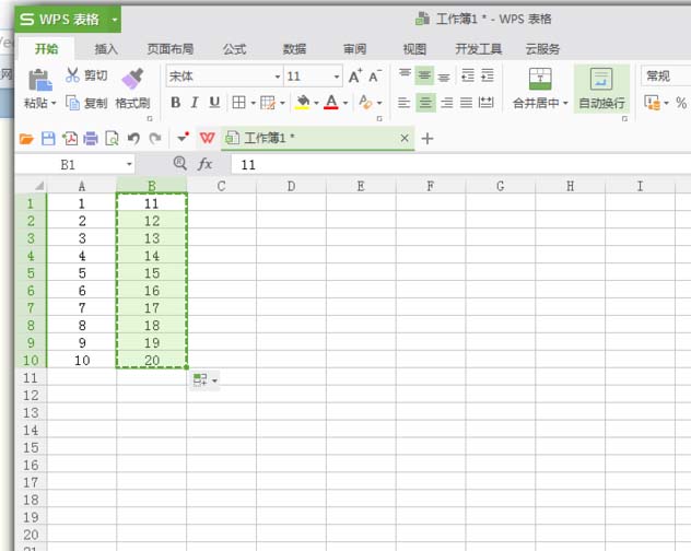 2、确定第二列(B列)数据。填充A列到10,然后以A1为起点,填充B列数据(数据为11-20)。如图: