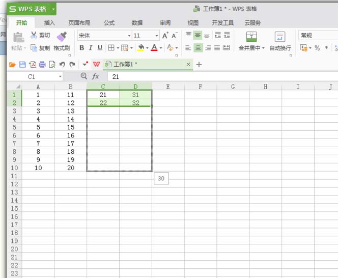 3、填充第三列和第四列(C列和D列)数据。以A、B为参考数据,纵横填充矩阵(鼠标拖动直接填充,若不能自动变换,请按Ctrl切换填充方式)。如图: