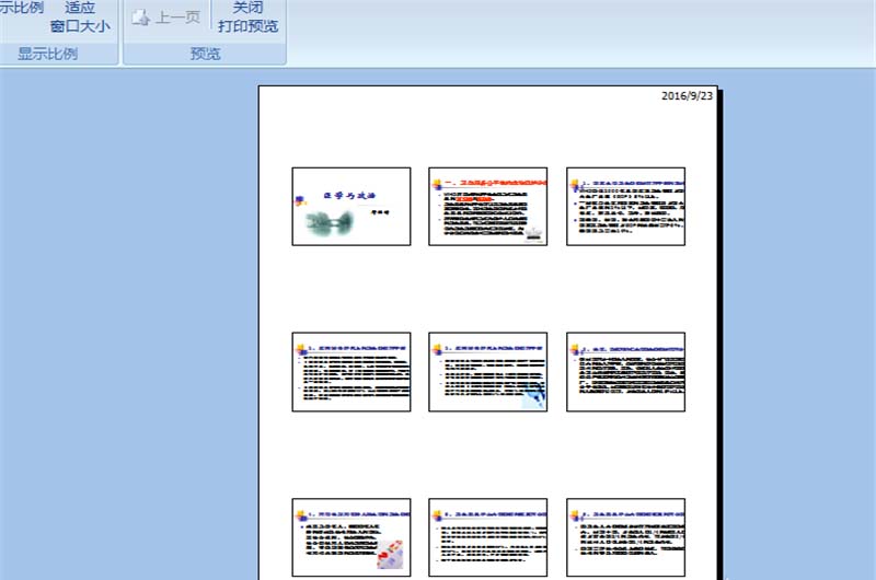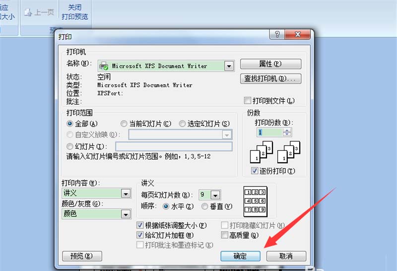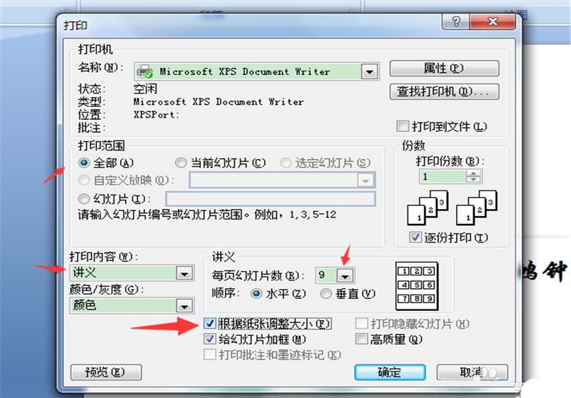 3、进入打印窗口之后,首先选择全部,打印内容改成讲义,每页幻灯片内容为9页,讲根据纸张调节大小(F),这个一定得打勾。