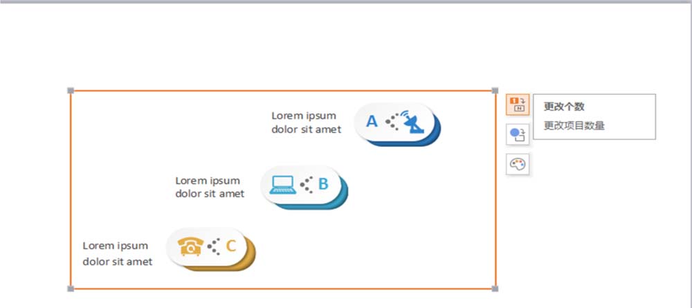 1、选中图示,点击图示的边框,在边框的右侧出现三个工具,最上边的就是更改图示个数的工具。